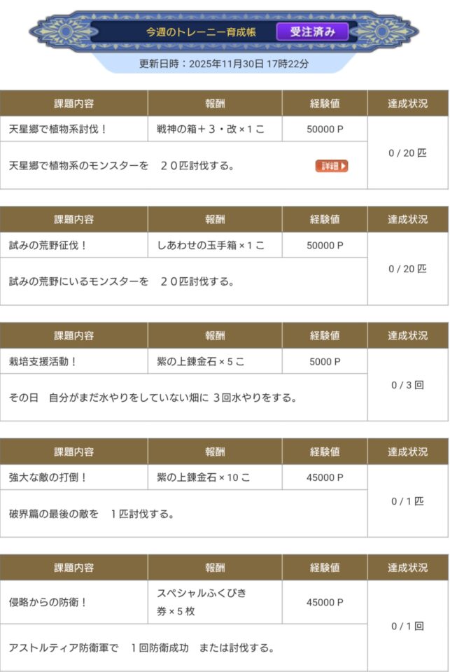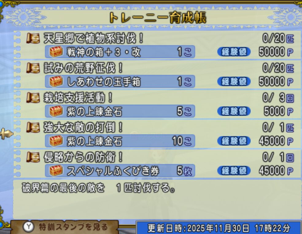 今週(11/30)のキタエルさんとバケンズさん 週課 Twitter Facebook はてブ Pocket LINE コピー 2025.11.30 人気ブログランキングへ 2つ同時が、おすすめ♪ 試みの荒野で、植物系の ズッキーニャが おすすめ♪ 強大な敵 シドー 2つ同時が、おすすめ♪ ゲルヘナ幻野 ゾンビ系のしのどれい・強 卓上競技 バトエン 人気ブログランキングへ ポチっと応援よろしくね↓