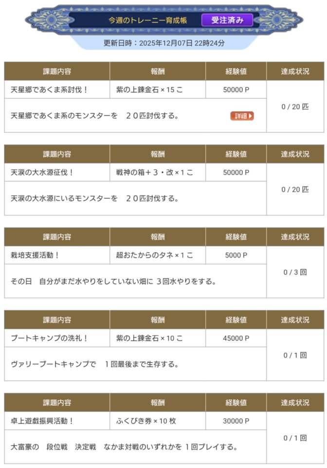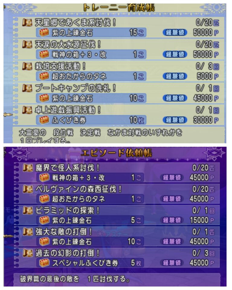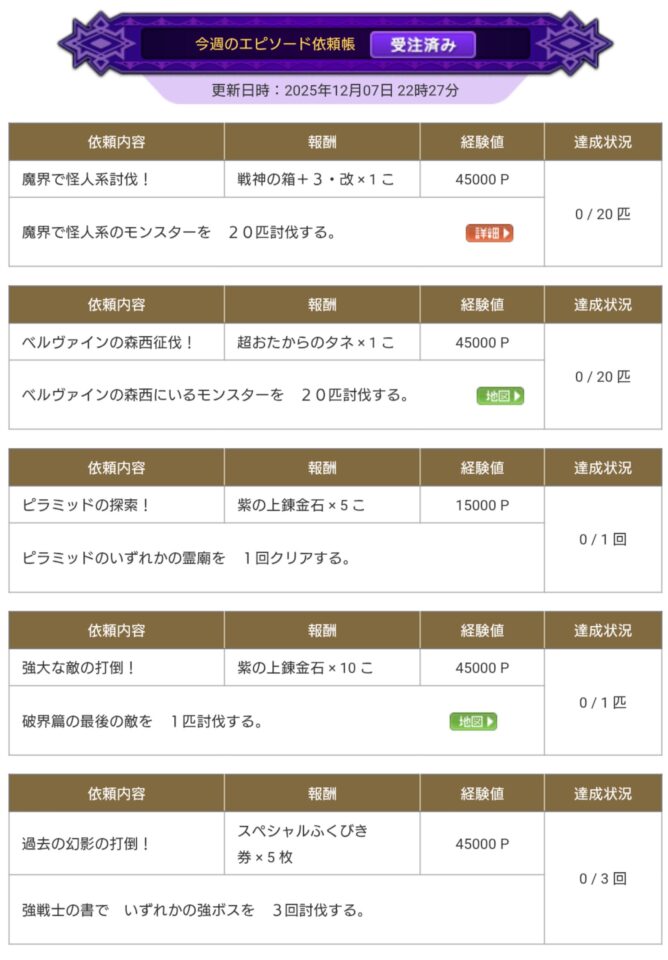 今週(12/ 7)のキタエルさんとバケンズさん 週課 Twitter Facebook はてブ Pocket LINE コピー 2025.12.07 人気ブログランキングへ 2つ同時は、 天涙の大水源 あくま系のモンスター あかつきの神兵 の討伐がおすすめ♪ ちょっとがんばっちゃおうね~ 卓上遊戯 大富豪 2つ同時は、無理だからコツコツ 経験値目的♪ 強大な敵 シドー 人気ブログランキングへ ポチっと応援よろしくね↓